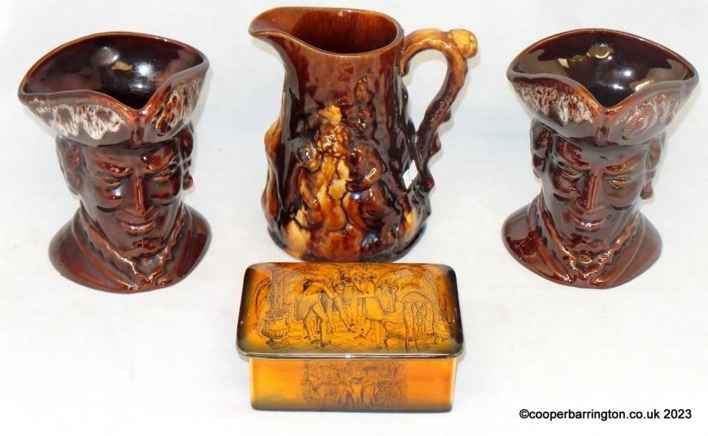A Pair of Kernwork Cornish Pottery Sea Captain Jugs. Height 17 cm. Also a Crown Devon Trinket Box/Cover and a Treacle Glaze Jug. (4 Items)