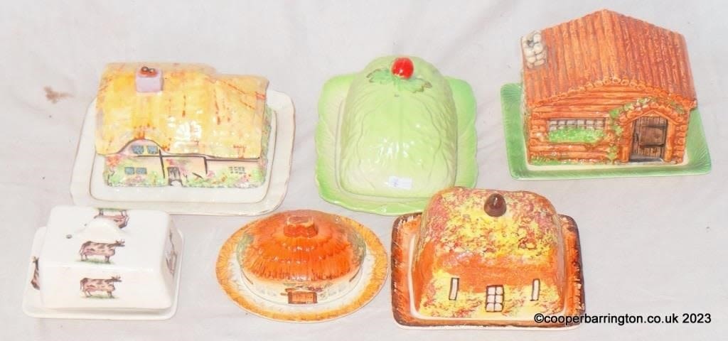 Vintage Beswick 252 Log Cabin / Cottage. Price Brothers Cottage Ware. Arthur Wood Lettuce & Tomato. Ann Hathaways Cottage and Crown Mark Cow Cheese Dish Holders. (6 items)
