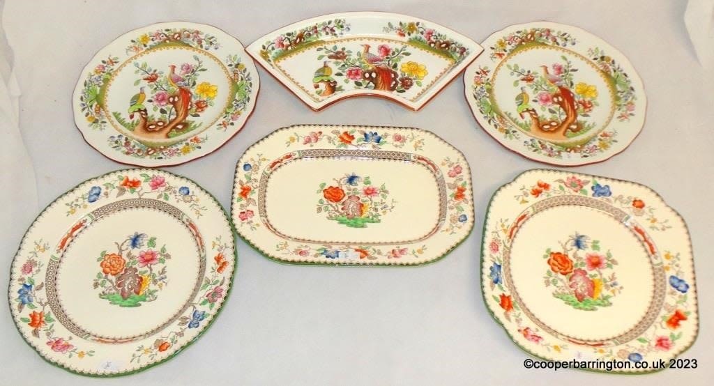 Antique Spode Copeland Collection: Waring & Gillow Pheasant Dessert Plates x 2. 1908. T Goode & Co. Pheasant Sweet Meat Dish. 1908. 3 x ‘Chinese Rose’ Plates. 1913. (6 Items)