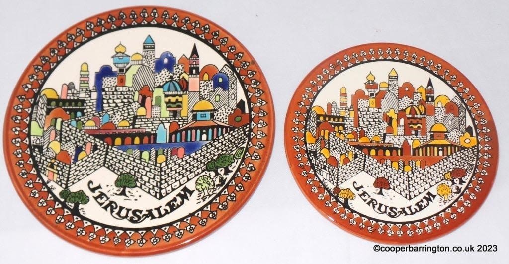 Jerusalem City Walls and Old City View Armenian Ceramic Handpainted Plates. Diameter 27 cm and 22 cm. (2 Items)