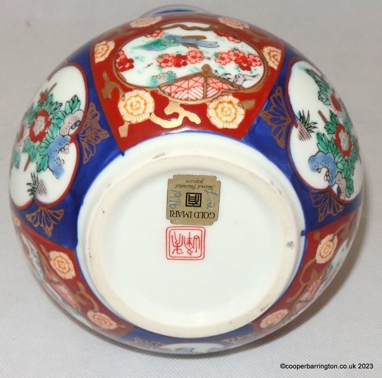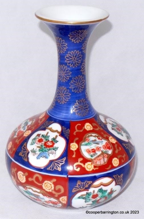 Vintage Chinese Imari Revival Flower/Display Vase. Circa 1976. Handpainted red and blue palette a hallmark of Imari. Red character mark and label to base. Height 21.5 cm.