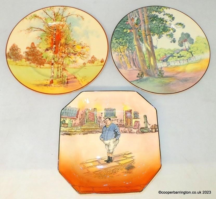 Royal Doulton Series Ware Cabinet Plates, Dickens ware Fat Boy Octagonal Bowl D6327 Diameter 22cm, Autumn Glory Plate, Australian Gum Trees Plate D6309 Diameter 27cm (3 items)