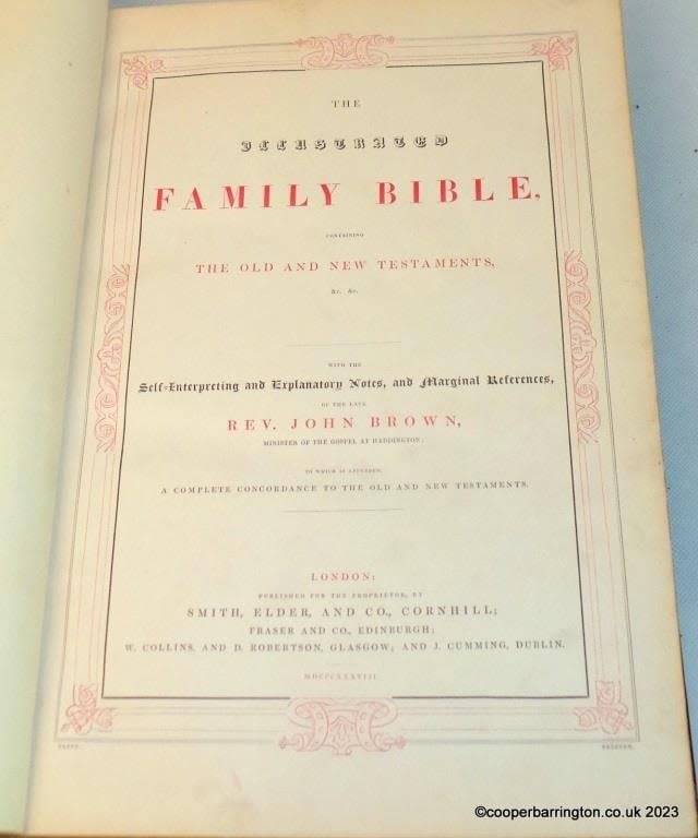 Victorian Illustrated Family Bible Hannay’s Concordance c.1838 (MDCCCXXXVIII) The Old and New Testaments, Self-enterpreting and Explanatory Notes, and Marginal References, of the late Rev, John Brown. London, Published for the proprietor Smith, Elder and Co, Cornhill; Fraser & Co, Edinburgh; W. Collins and D Robertson Glasgow and J Cumming, Dublin. Unmarked. 1000 Printed Pages