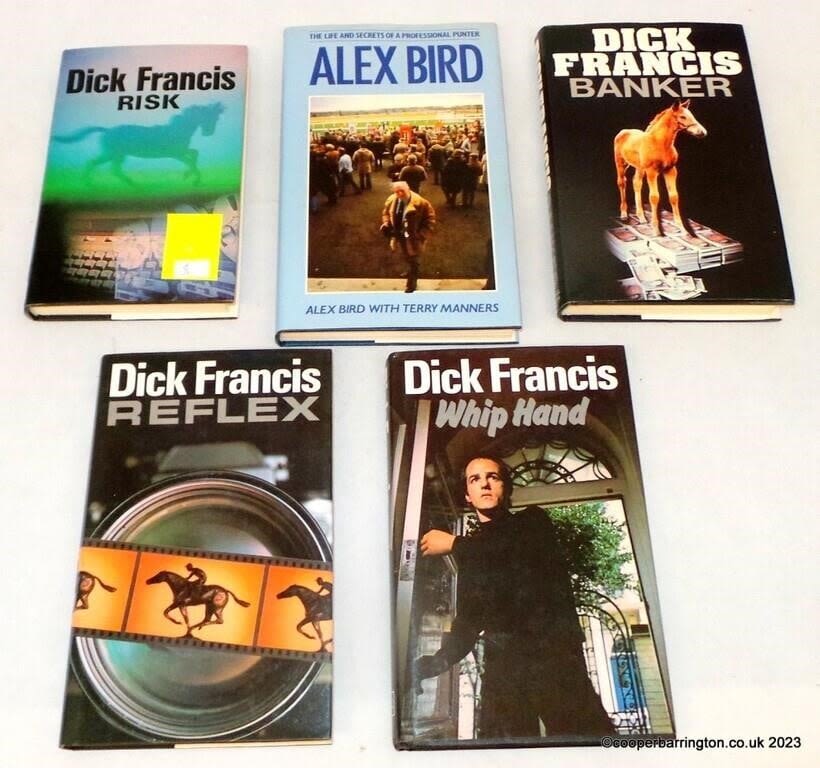 Signed Dick Francis 1st Edition Hardback Editions to Include: Reflex. Whip Hand. Risk and Banker plus Alex Bird. All with dust jackets. (5 Items)
