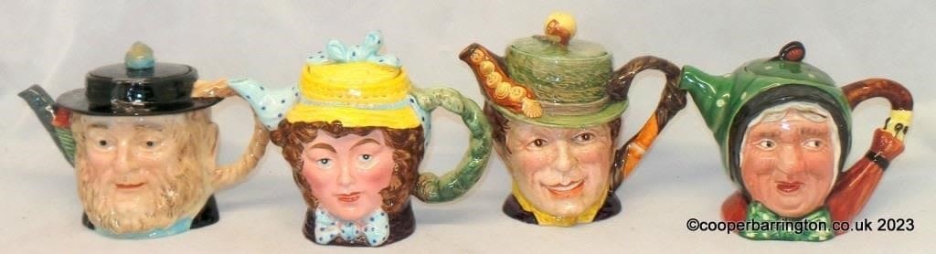 Beswick Dickens Character Teapots Set Comprising: Sam Weller 1369. Peggotty 1116. Dolly Varden 1203. Sairey Gamp 691. No damage. (4 Items)