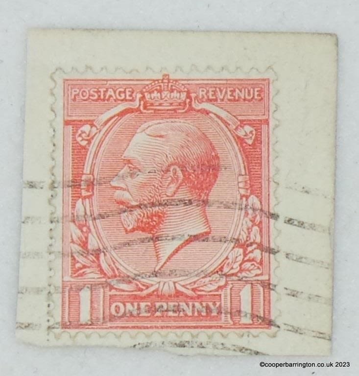 Great Britain KGV 1d Red 1912-24 Watermark Royal Cypher ” Q Flaw” Used on Piece. SG357ab.