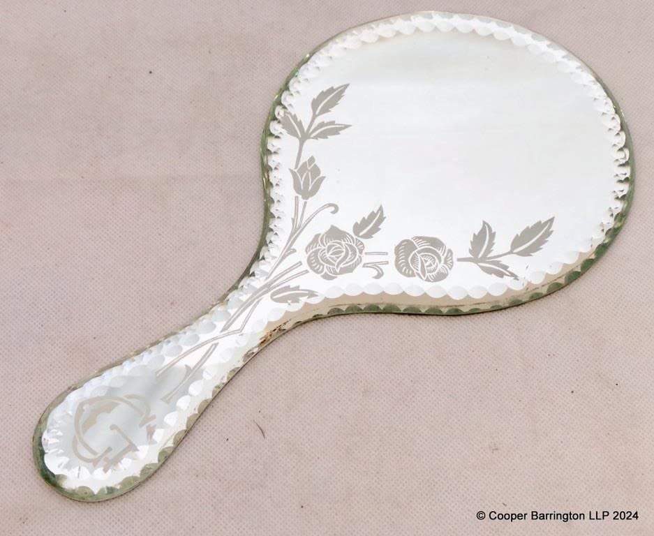 Antique Venetian Vanity Hand Mirror. Early 1900s. Etched and cut glass with beveled edge. Monogramed CG. Length 28 cm.