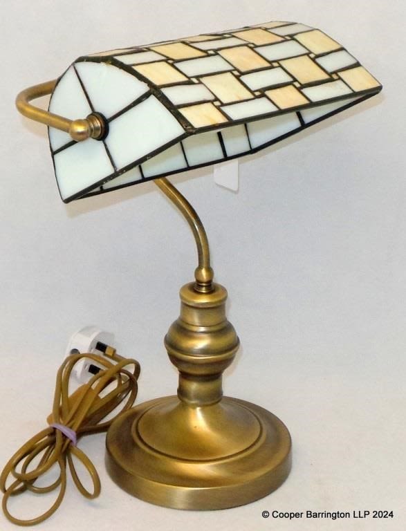 Vintage Bankers Table Lamp with White Leaded Glass Shade. Working order.