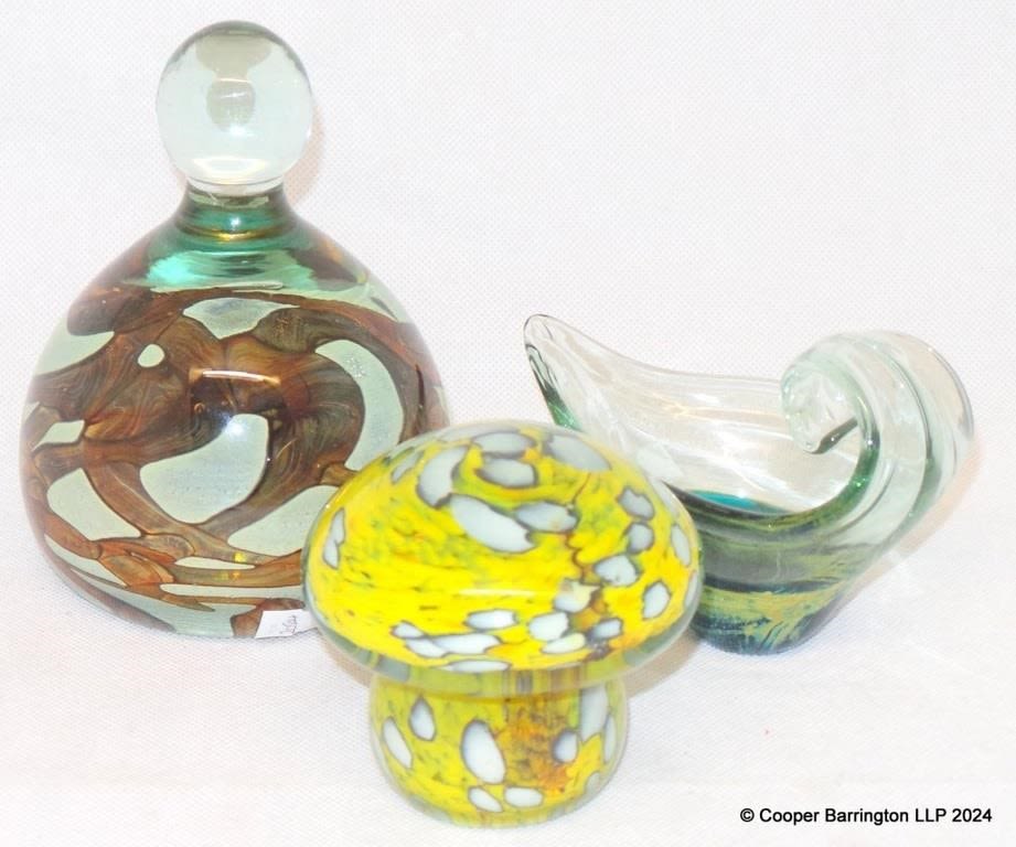 Signed Art Glass Mdina Mushroom and Dump Paperweights and a Mdina Sea & Sand Dish. (3 Items)