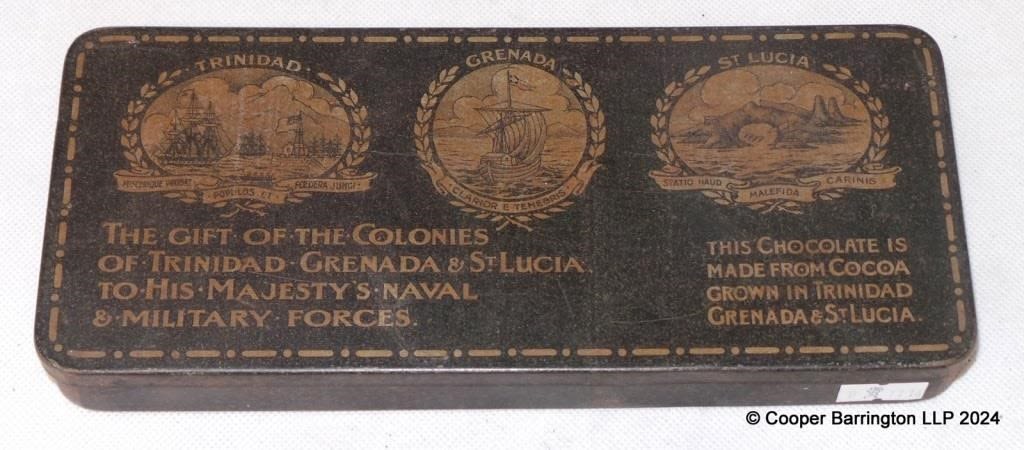 WWI British Chocolate Gift Tin: “The Gift of the Colonies of Trinidad,Grenada & St Lucia to His Majesty’s Naval & Military Forces”. No contents. 23 x 10 cm.