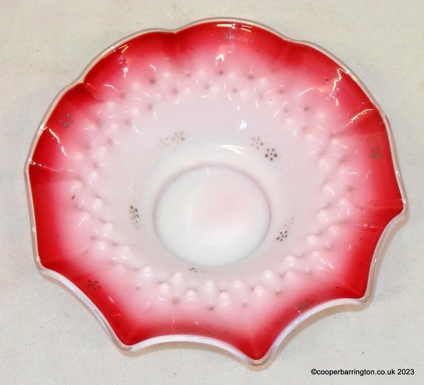 Victorian White to Pink Ruffle Bowl . Late 19th Century. The exteriour is white and the interior shades from a very pale pink to a dark cranberry pink ..The rim is trimmed in clear glass. Diameter 21 cm.