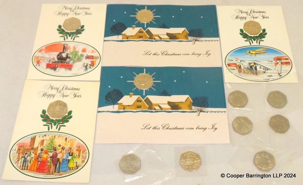 POBJOY MINT Isle of Man Christmas Card 50p 1982,1984 x 2.1985 and 1986 x 2 sealed Brilliant uncirculated . Also Royal Mint UK 50p 1973 x 5 and 1977 uncirculated. (12 Items)