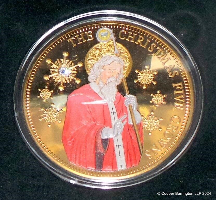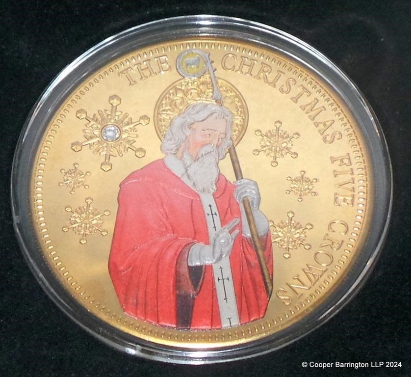 Cased Commonwealth Mint Tristan da Cunha 5 Crowns St Nicholas Christmas 2014. 24 Carat Gold Plated with Swarovski Crystal. Known Mintage 4,999. Diameter 65mm.