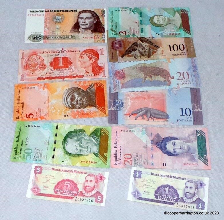 South America Collection of Banknotes to Include: Nicaragua. Bolivia. Honduras. Peru. 8 Uncirculate. (11 Items)