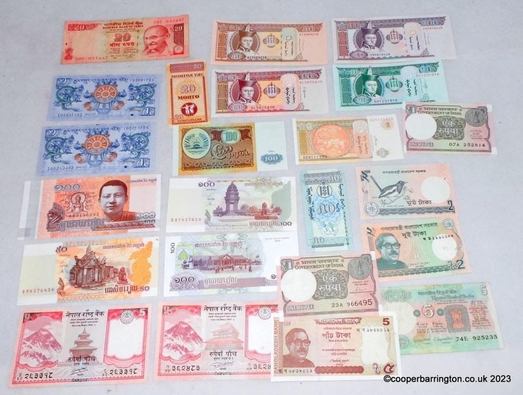 Asia Collection of Banknotes to Include: Bhutan. Cambodia. Thailand. Bangladesh. Nepal. India. 21 Uncirculated. (23 Items)