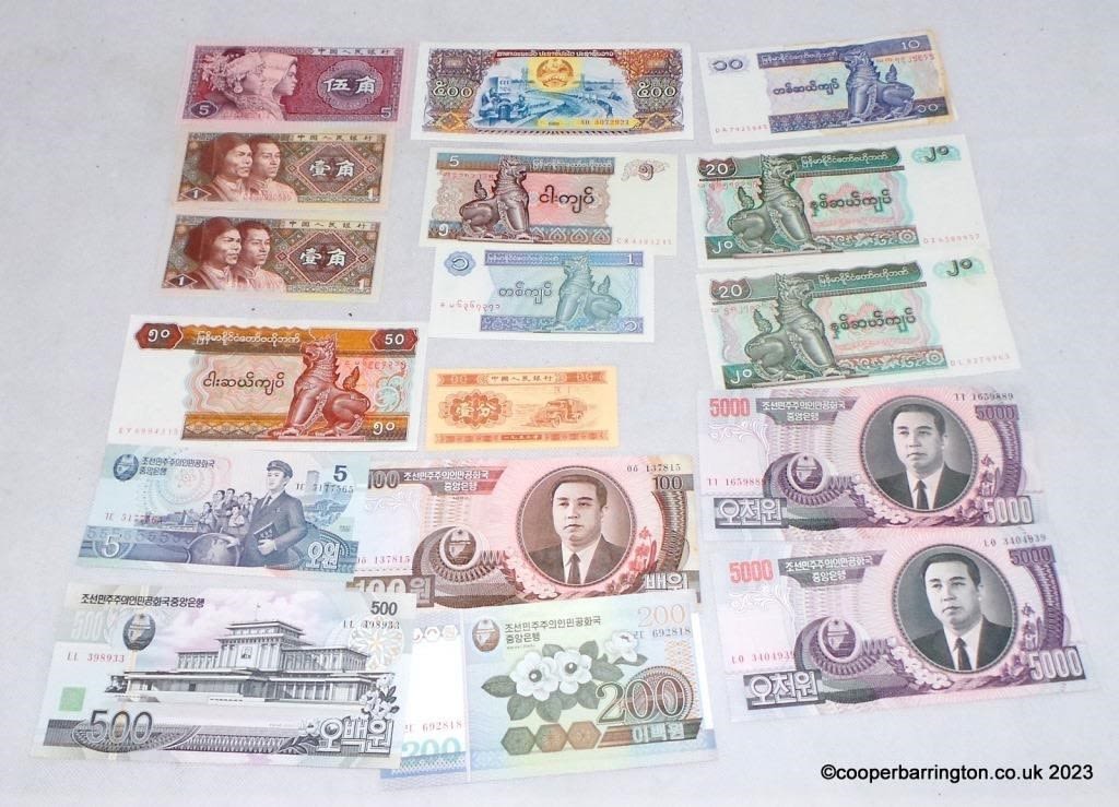 Asia Collection of Banknotes to Include:China. Laos. Myanmar. Korea. 17 Uncirculated. (17 Items)