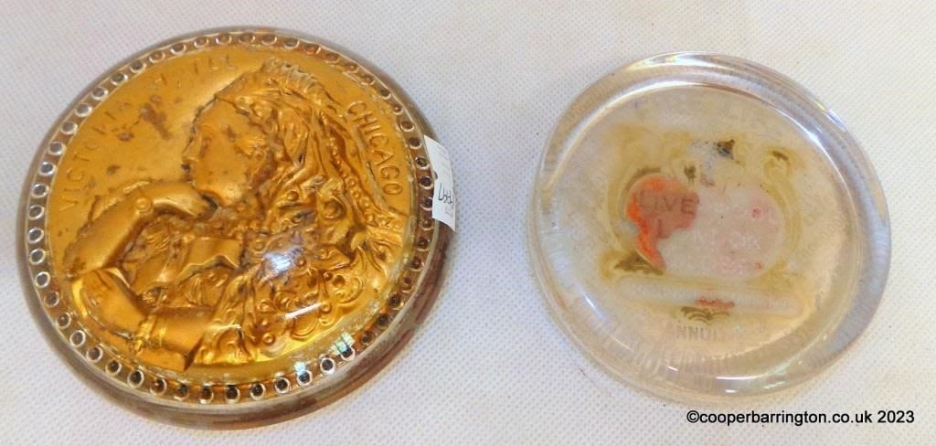 Queen Victoria Glass Advetisement Paperweight ” Victoria Hotel Chicago”. Diameter 10 cm. Also one other “The Liverpool and London and Globe Insurance Company”. Diameter 9cm. (2 Items)
