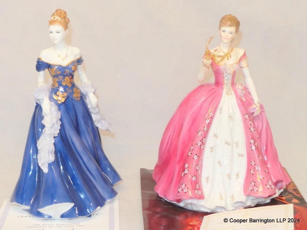 Royal Worcester Limited Edition Figurine ” Venetian Masquerade” with Certificate No.98./7500. CW696. Also Royal Worcester Figurine of the Year 2001 ‘Lauren’ with Certificate.CW524.. Both boxed with no damage. (2 Items)