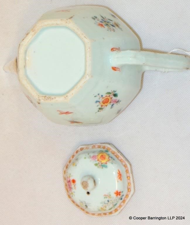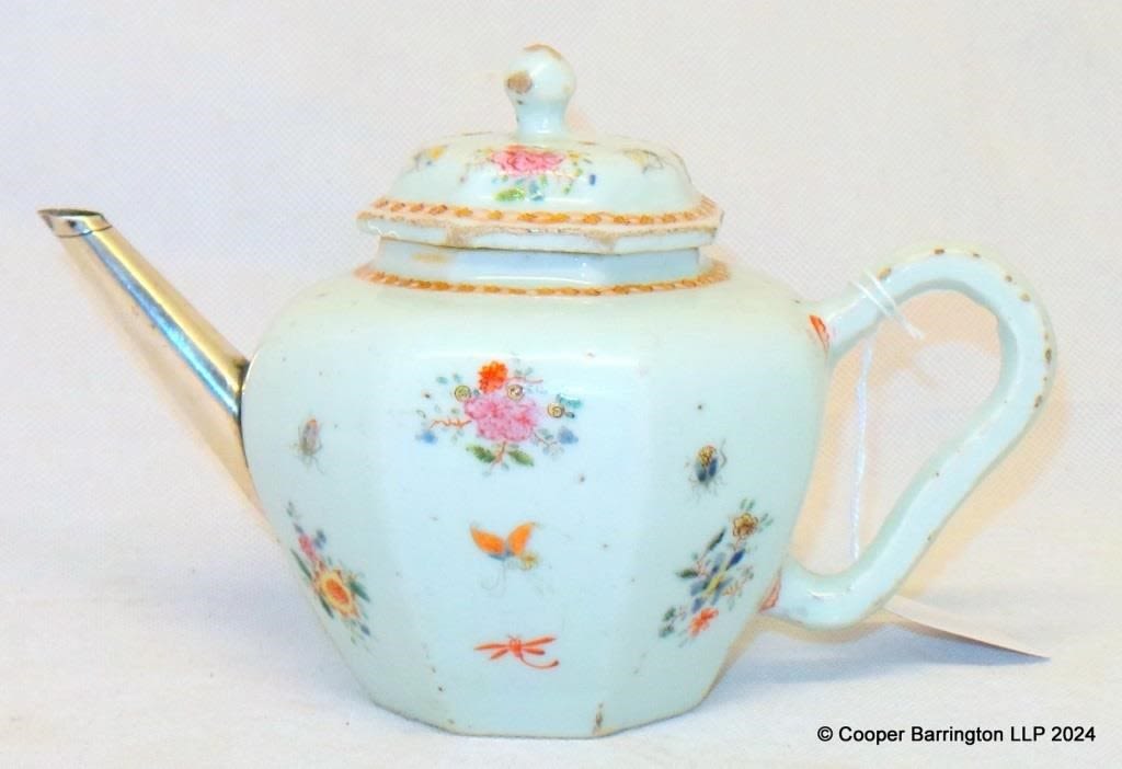 Late18th Century Qing Dynasty Teapot with Silver Spout. This octagonal form porcelain teapot was made in China during the latter end of the 18th century and has a19th century inventive replacement silver spout. Folate and insect decoration in the famille rose palette. Height 12.5 cm. Width 19.5 cm