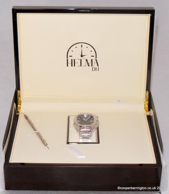 Men’s HELMA DH PORTOFINO WATCH – Deep Green Textured Dial – Sapphire Crystal Glass-Stainless Steel Case-5 ATM Water Resistant-Hand Assembled. New in original wooden box.
