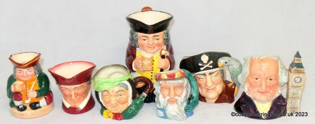 Royal Doulton Character Jugs Long John Silver. Neptune. The Cardinal. John Doulton (Collectors Club). Sairey Gamp. Also Toby Jugs Jolly Toby and Honest Measure. (7 items)