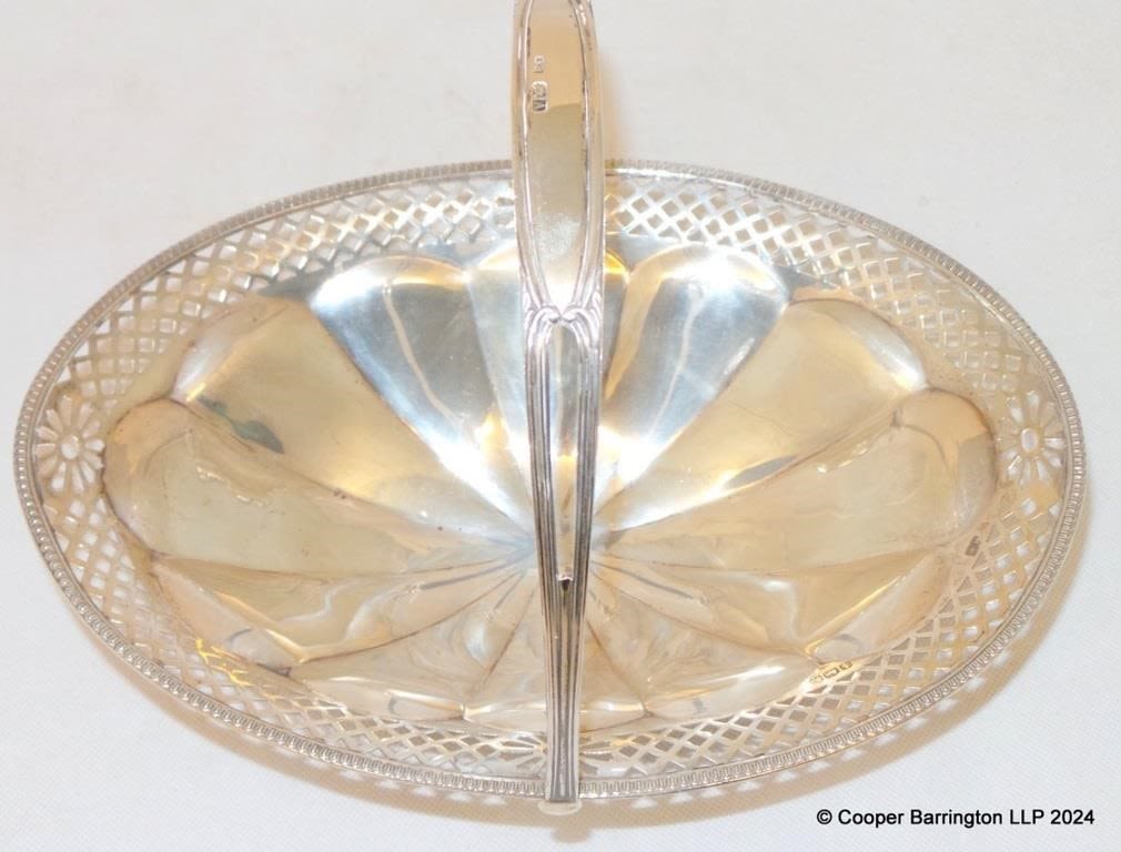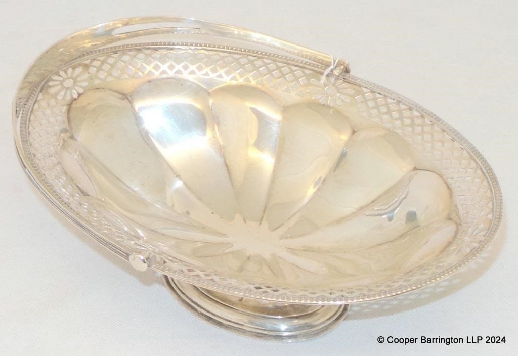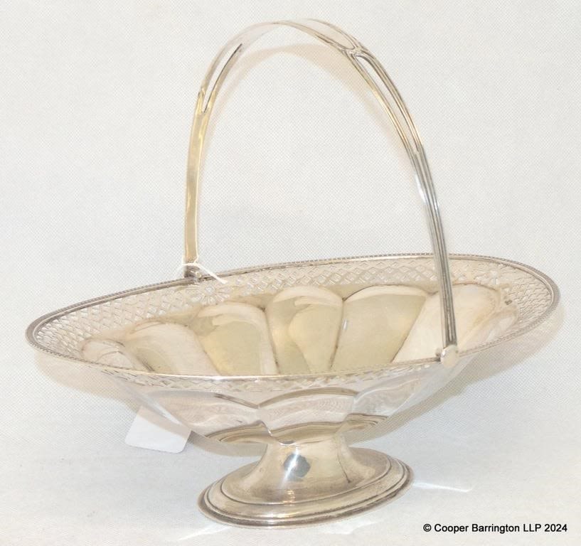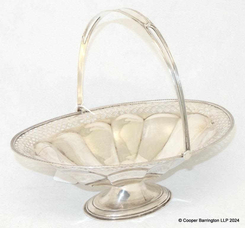 KGV Sterling Silver Pierced Swing Handled Fruit Basket by Henry Matthews. Hallmarked Birmingham 1925. 337 gm length 27 cn, Width 19 cm. Height 22 cm.