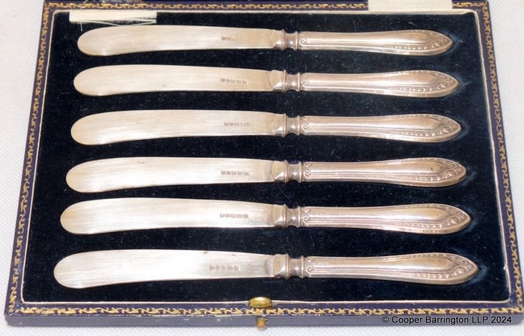 Cased KGV Sterling Silver Mounted Butter Knife Set by Yates Brothers. Hallmarked Sheffield 1923. (6 Items)