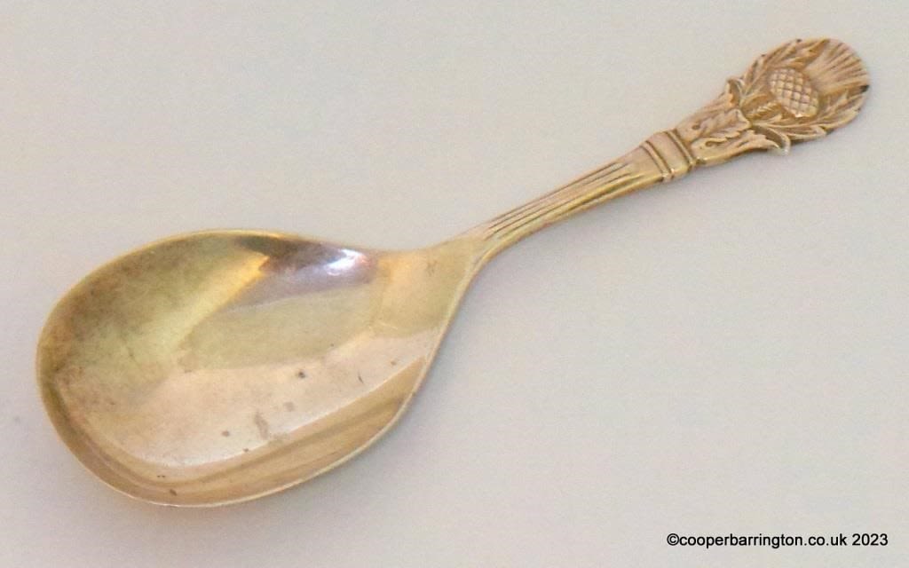 QEII Sterling Silver Caddy Spoon with Thistle Finial by C.Robathan & Son. Hallmarked Birmingham 1956.