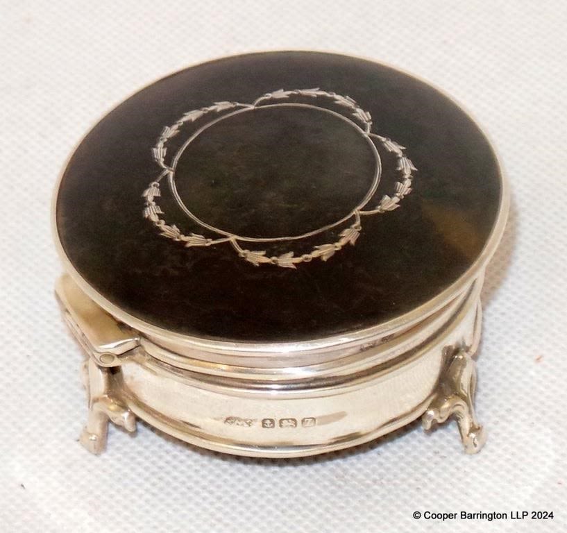 KGV Sterling Silver and Inlaid Tortoiseshell Trinket Box by Adie Brothers Ltd. Having hinged cover raised on Fleur-de-lis legs.Hallmarked Birmingham 1924. Diameter 6.2 cm.