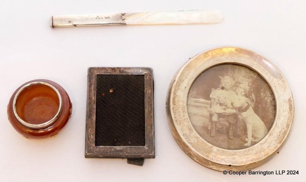 Edwardian Silver Mounted Mother of Pearl Paper Knife by Adie & Lovekin Ltd. Doulton Lambeth Silver Mounted Harvest Salt Pot. Hallmarked Chester 1897. Two Silver Photograph Frames 1910 & 1924. (4 items)