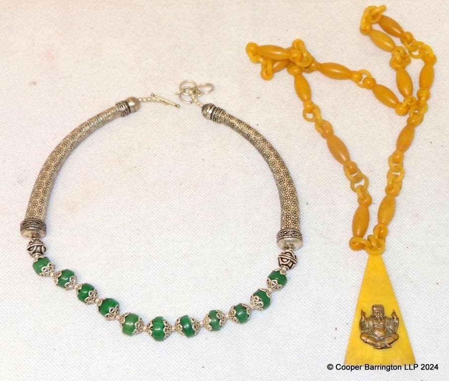 Chinese Silver and Green Jade Necklace. Length 45 cm. Plus one other. (2 Items)