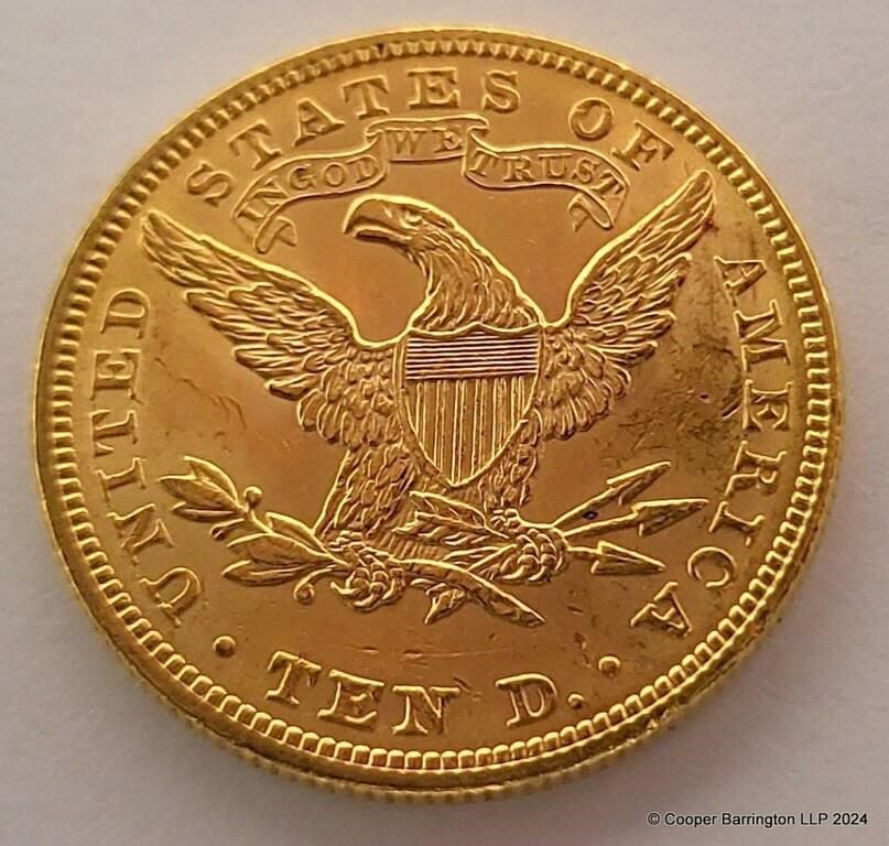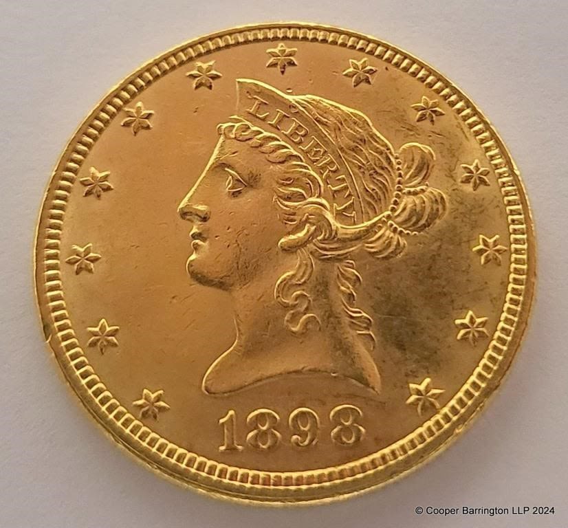 1898 Coronet Head Gold $10 Eagle New Style Liberty Head – With Motto. Minted at: Philadelphia (No Mint Mark). Uncirculated with lustre. 16.70 gms. Diameter: 27 mm