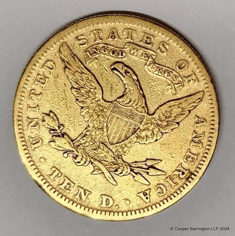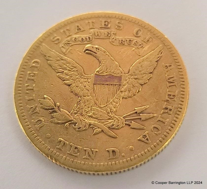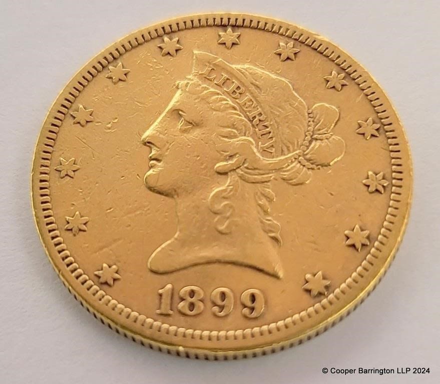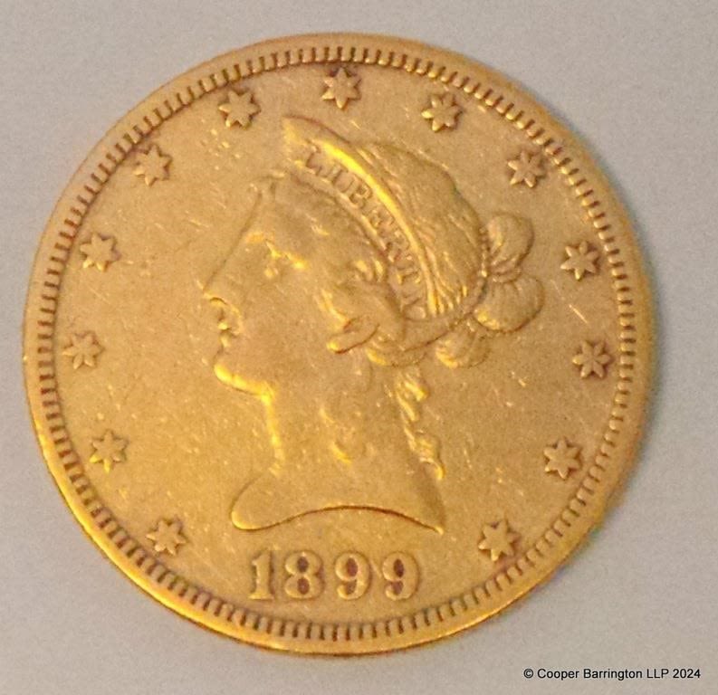 1899 Coronet Head Gold $10 Eagle New Style Liberty Head – With Motto. Minted at: Philadelphia (No Mint Mark). Fine 16.70 gms. Diameter: 27 mm
