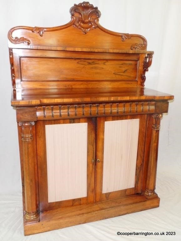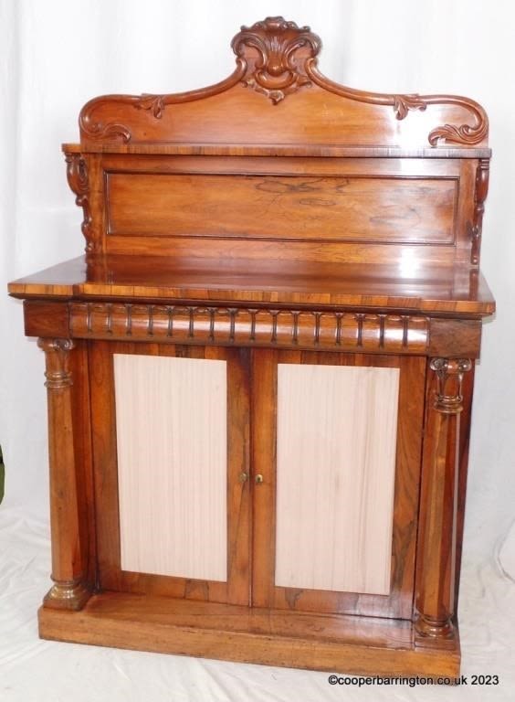 Good Late Georgian Regency Rosewood Chiffonier. Circa Early 19th Century. The raised and carved shaped back with upper shelf supported on carved brackets above a figured top. Sitting above a single drawer with carved decoration and two cupboard doors fitted with pleated fabric backing,flanked either side by scroll top tapered octagonal pillars. The interior has two shelves split into four.All supported on a plinth base. Height 60 in. Width 42 in. Depth 18.5 inches.