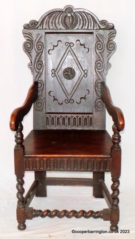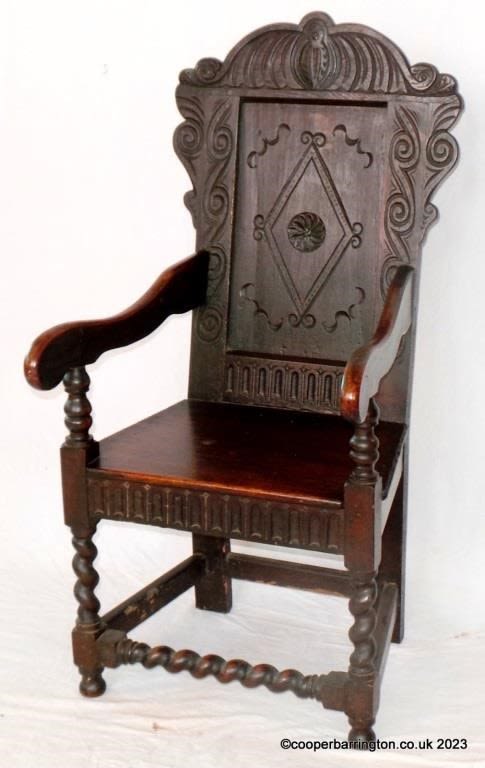 Antique Victorian Carved Oak Wainscote Chair. 19th Century. Solid oak construction with carved and shaped top rail and backrest leading down swept armrests on turned supports. The plank seat with carved skirt all raised on barley twist legs to the front. Height 47 inches.
