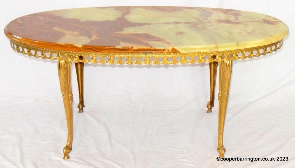 Vintage Green Onyx and Brass Coffee Table. 20th Century. The moulded oval top supported on a decorative brass frame with cabriole legs. Height 17.5 in. Width 40 in.Depth 19.5 in.