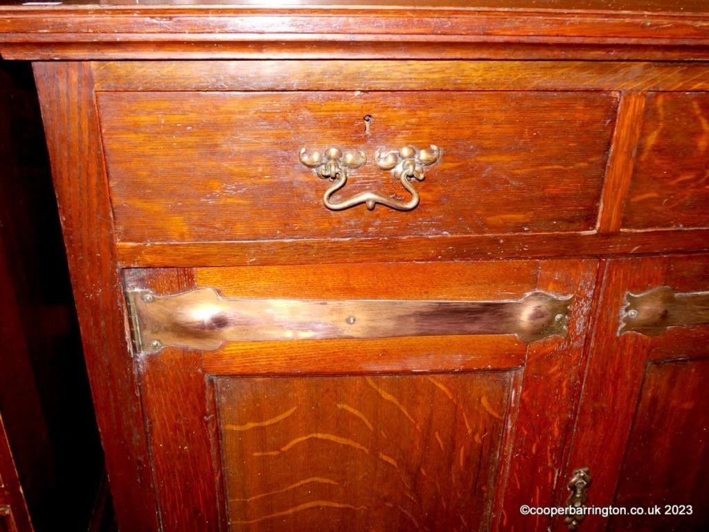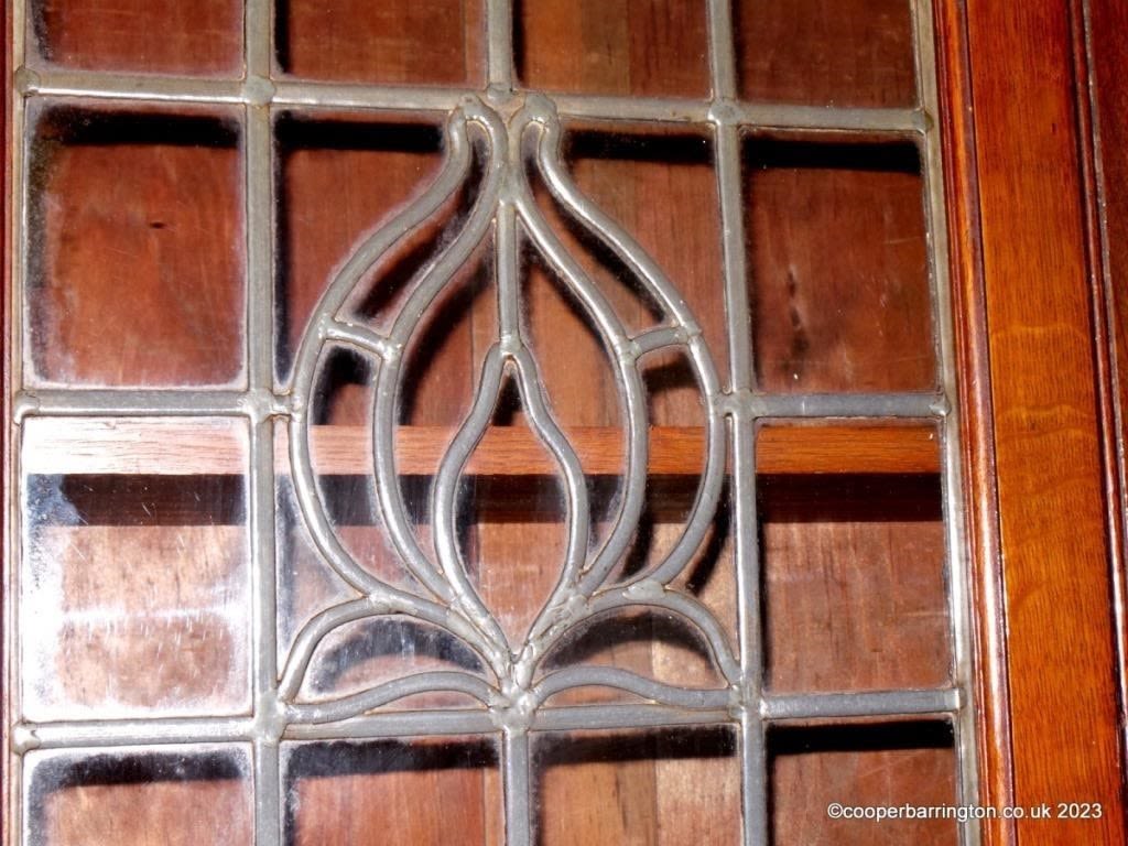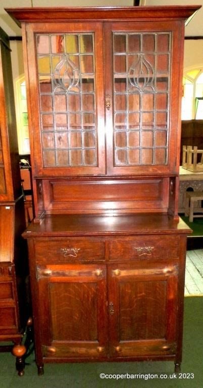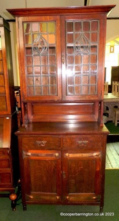 Arts & Crafts Oak Bookcase. Early 1900. The deep cornice over 2 styilized lead glazed doors enclosing two shelves. Below two drawers and two cupboards with decorative strap hinges raised on turned tulip feet. Height 79 in. Width 36 in. Depth18in.