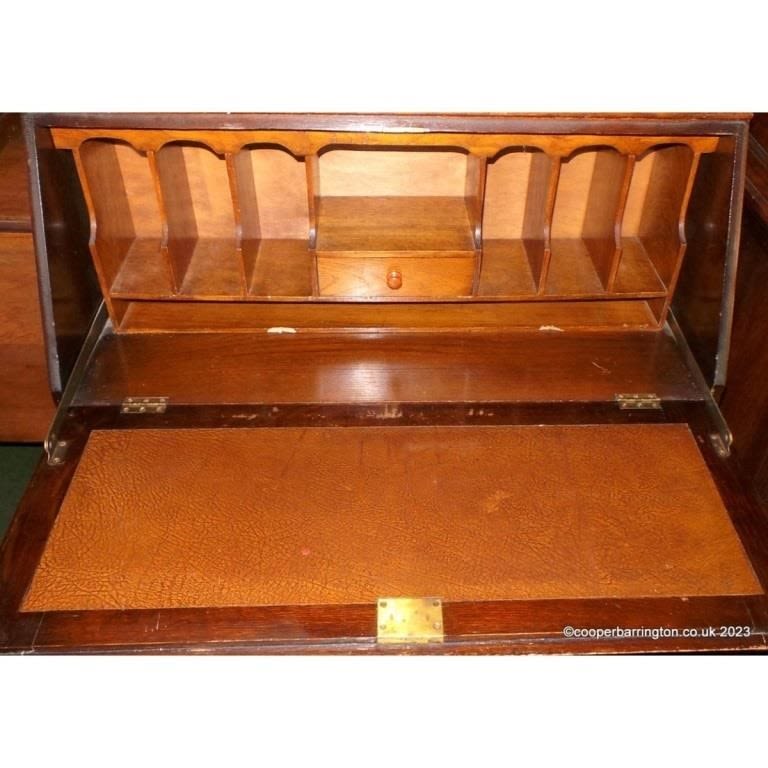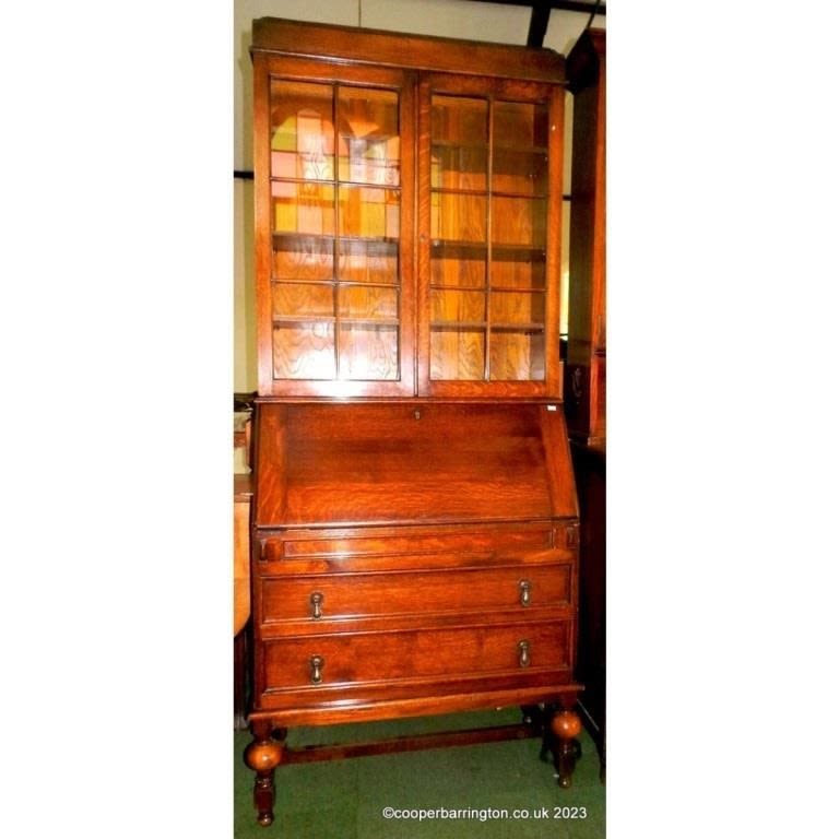 1920s Oak Bureau Bookcase. The caddy top over 2 glazed doors enclosing two adjustable and one fixed shelf. Below the fallfront on automatic loafers opens to reveal a fitted interiour and letherette writing surface all over 2 drawers raised on turned ball feet. Height 79 in. Width 32.5 in. Depth16. 5 in.