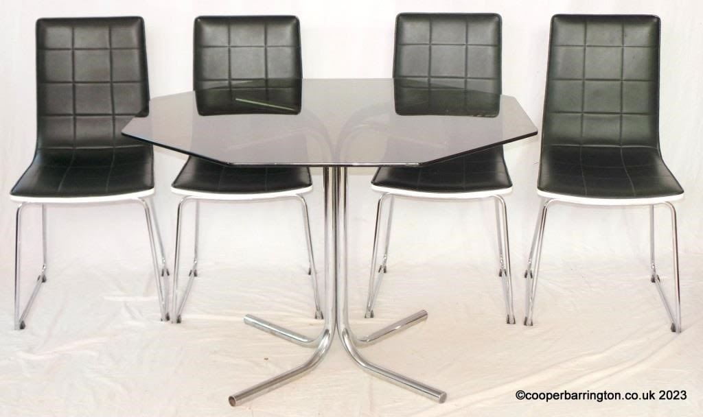 Kare Design Germany “High Fidelity” Kitchen Chairs + Andevost Octagonal Smoked Glass/Chrome Table. Height 29 in. Diameter 42 in. (5 Items)