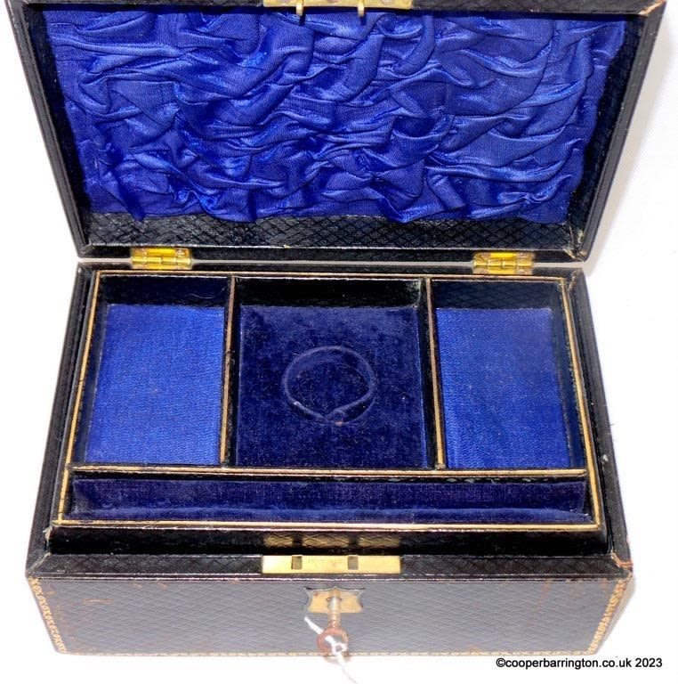 Victorian Dome Top Tooled LeatherJewellery Box. Late 19th Century.Blue velvet and silk fitted interior. Working lock and key. 23 x 16 x 10 cm