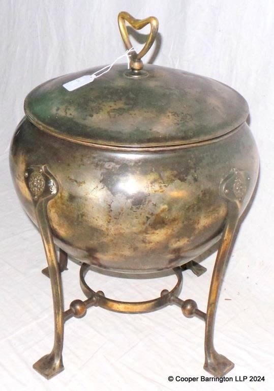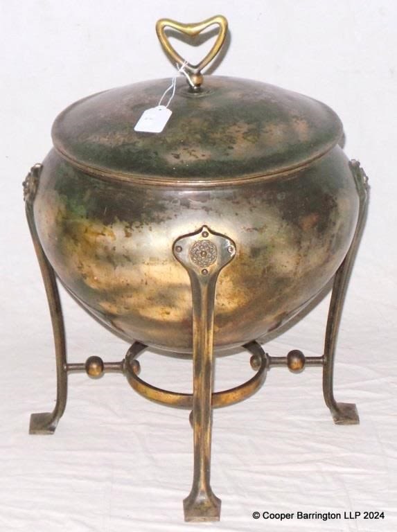 Art Nouveau Cauldron Ash/Coal Bucket. Early 1900s. The large lidded bowl is carried on 4 decorative legs with a circular ring support. Complete with inner liner and coal tongs. Height 53 cm. Diameter 38 cm.