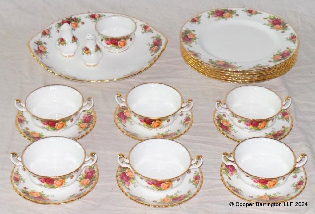 Royal Albert Country Roses 22 Piece Dinner Set to Include 6 x 10″ Dinner Plates. 6 x Soup Bowls/Saucers. Salt & Pepper Pots. Serving Plate. 1st Quality. (22 Items)