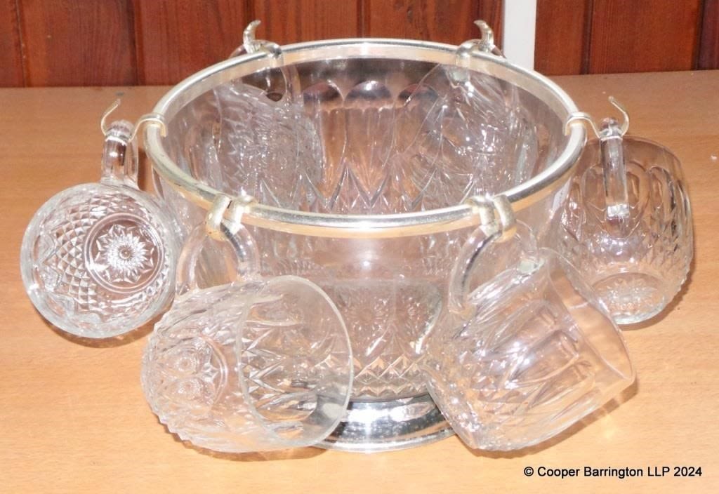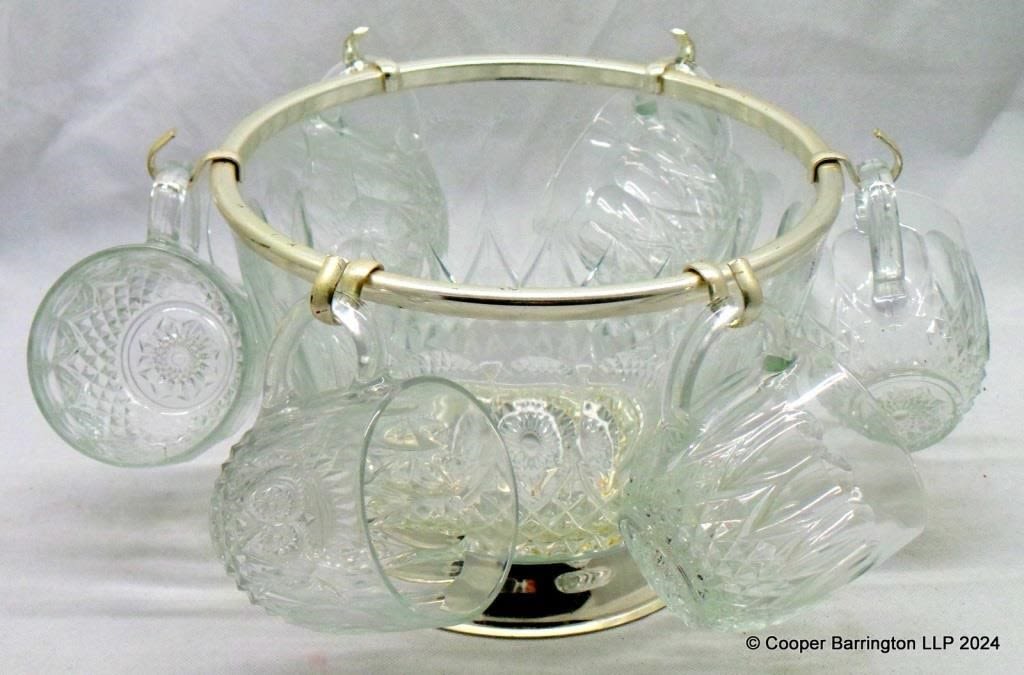 Reims France Cut Glass and Silver Plate Punch Bowl Set, with 6 Cups. 20th Century. (7 items)
