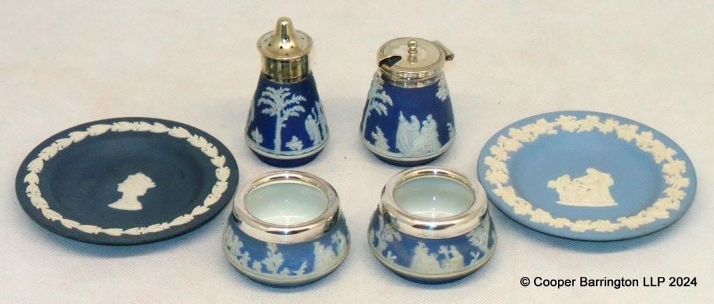 Wedgwood Dark / Light Blue Jasperware to Include: 2 x Salts. Mustard Pot. Pepper Pot all with Silver Plate Mounts and 2 x Pin Dishes. (6 Items)