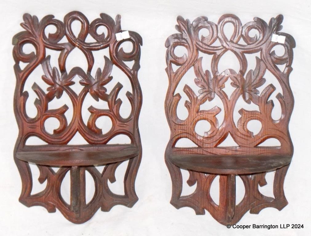 Antique Pair of Hand Carved Pine Wall Shelves. Early 1900s. Height 37 cm. Width 22 cm. Depth 12 cm. (2 Items)