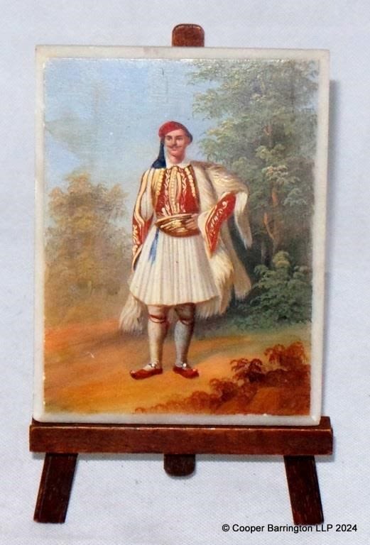 Antique White Marble Tile Handpainted with Greek Male in Traditional Costume. Late 19th Century . By unknown Greek artist. Marked to Verso Store in Athens? 12 x 15 cm. With easel stand. (2 items)