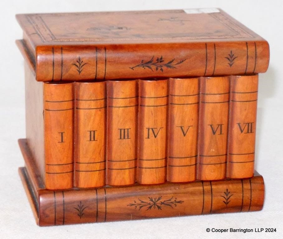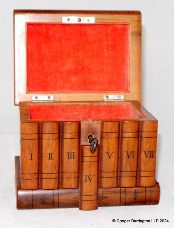 Italian Inlaid Antique Pile of Books Puzzle Jewellery Box with Secret Lock and Compartment. Early 1900s. Made in Sorrento of olive wood in the form of books all numbered with Roman numerals. Complete with working lock & key. 13.5 x 10 x 10.5 cm.