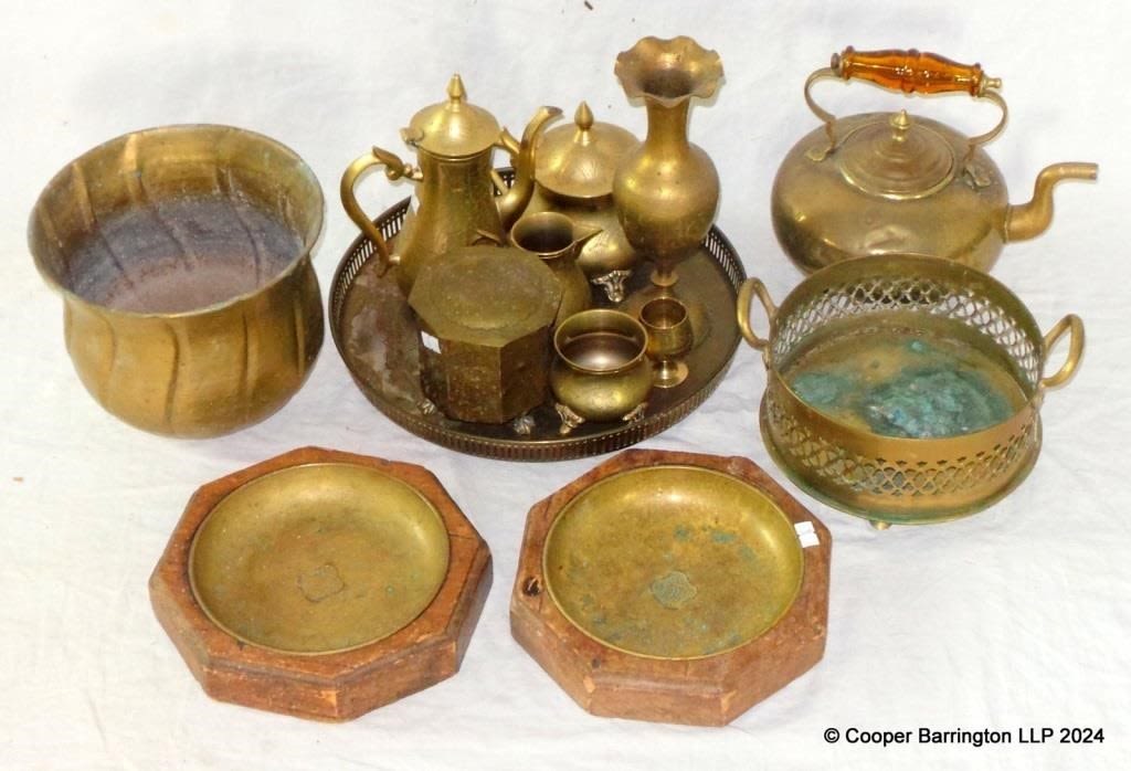 Vintage Collection of Brass Items to Include: Tray. Tea Caddy. Kettle. Jardeniere. Tea/Coffee Pots Etc. (12 Items)