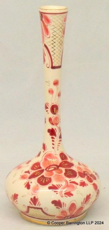 Vintage Delft Polychrome Bottle Bud Vase Rood Regina. Mid 20th Century. Hand Painted Floral and Giltwork.,. Height 22.5 cm.