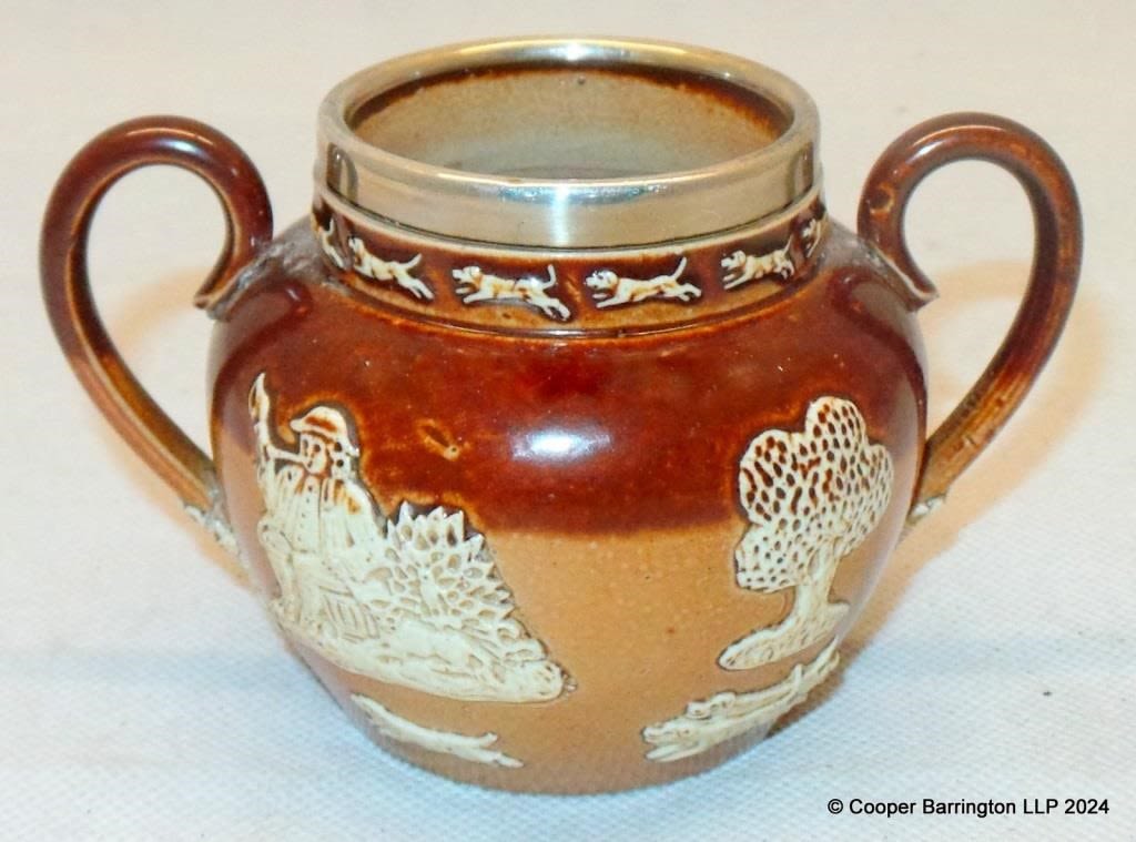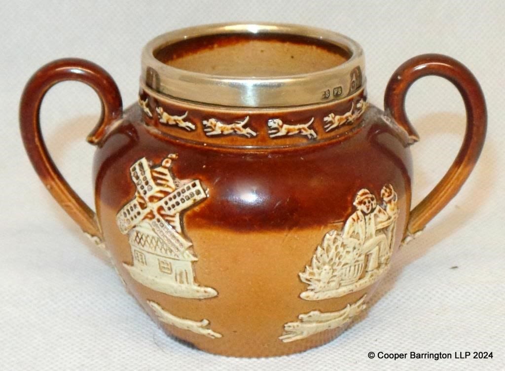 Doulton Lambeth Silver Mounted Sugar Bowl.